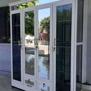 Lemari aluminium kaca pada gambar merupakan contoh furnitur modern yang menggabungkan fungsi penyimpanan, estetika minimalis, dan daya tahan tinggi. Desainnya yang ramping dengan rangka aluminium berwarna putih serta panel kaca bening dan kaca gelap menjadikan lemari ini cocok digunakan di berbagai ruangan, baik rumah tinggal maupun area komersial.